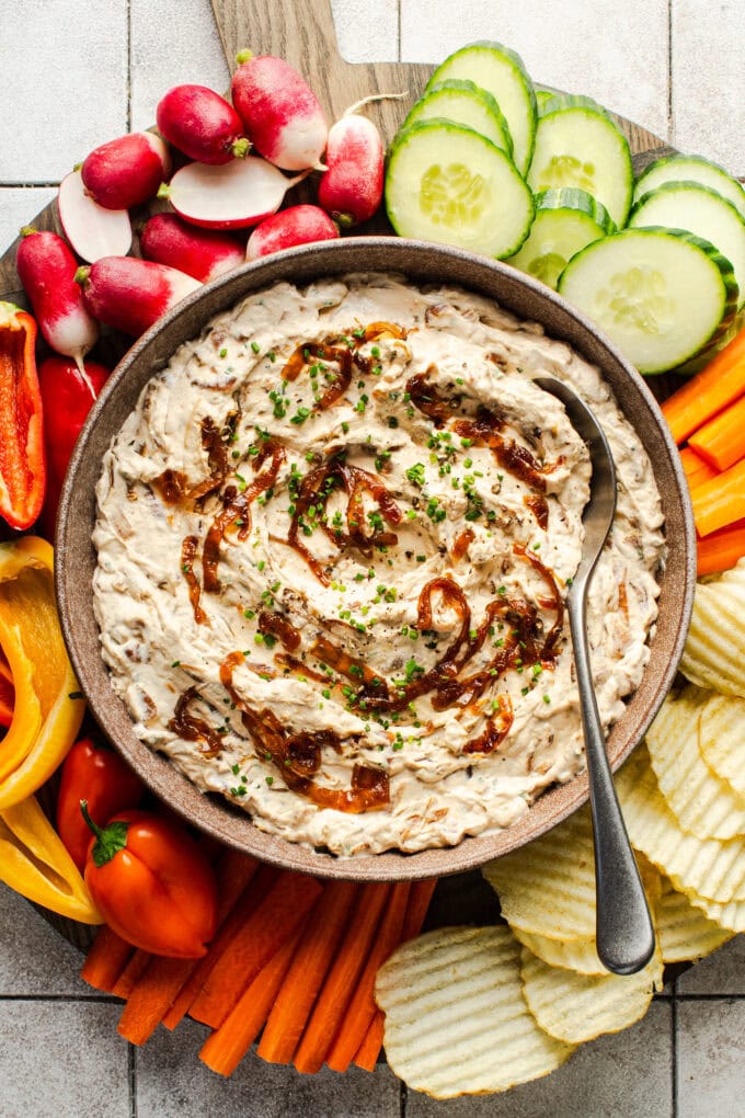 - Serve the caramelized onion dip immediately. We love serving this dip with thick/sturdy potato chips and/or an assortment of veggies, crudité style (celery/carrot, bell pepper slices, radish, etc.). Enjoy!